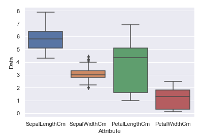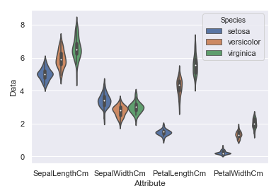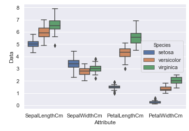 Iris1 = pd.DataFrame({"Id": np.arange(1,151), 'Attribute': 'SepalLengthCm', 'Data':df_Iris.SepalLengthCm, 'Species':df_Iris.Species})