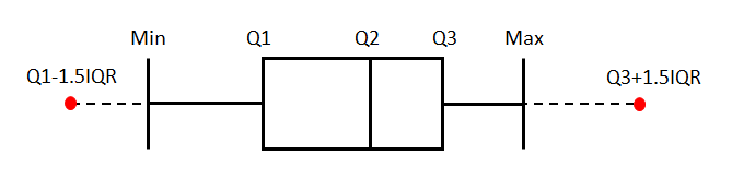 对于异常点的定义: 区间[Q1-1.5IQR, Q3+1.5IQR]之外的点, 其中Q1下四分位数(25%), Q3上四分位数(75%), IQR=Q3-Q1