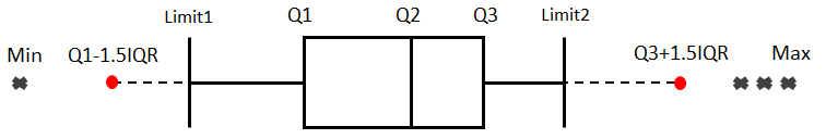 如果数据中有异常点, 那么箱线图的下边缘Limit1指的是区间[Q1-1.5IQR, Q3+1.5IQR]内的最小值, 上边缘Limit2指的是区间内的最大值, 即下图的实线部分(虚线以及红点部分不会显示)
