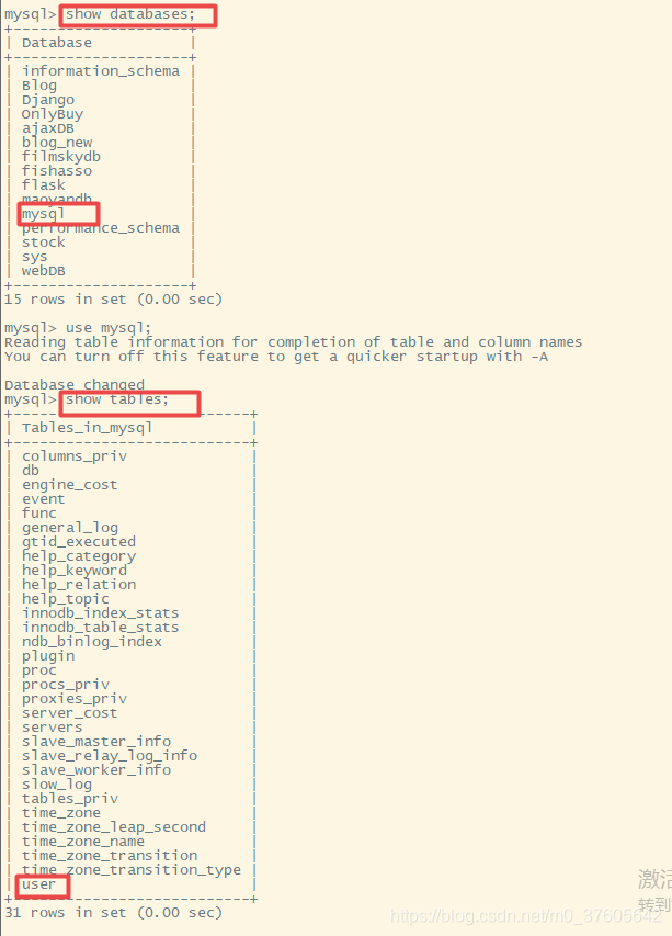 >> show databases;5. 进入mysql数据库