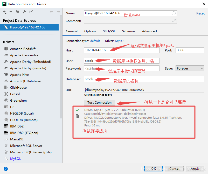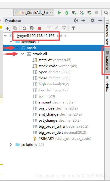 db = pymysql.connect(host='远程主机ip', user='数据库用户名', passwd='数据库密码', db='stock', charset='utf8')
