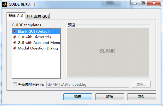 2、在 主页下的“新建”选项中选择新建一个图形用户界面(GUI),结果如下: