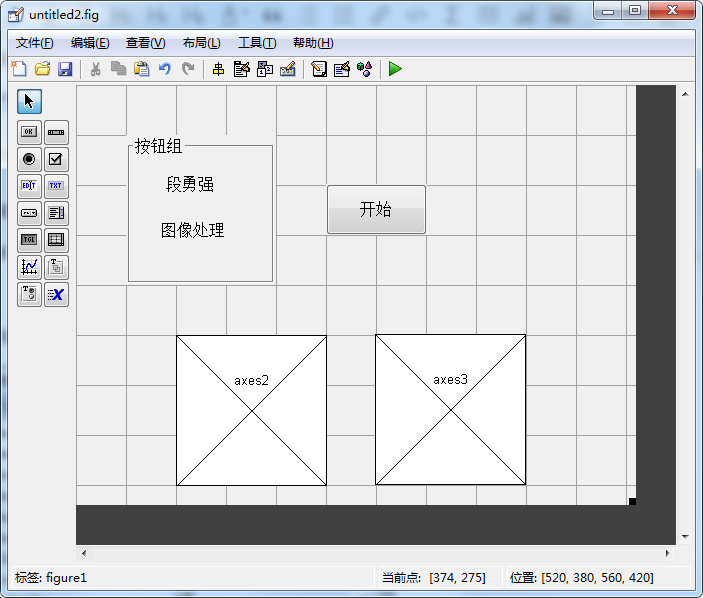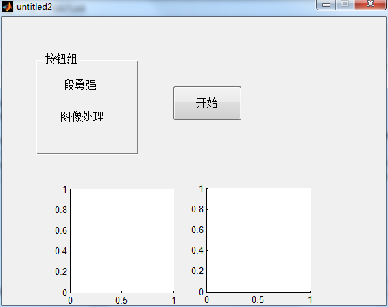 6、接下来我们设计一个图像处理的简单GUI,其中包括一个按钮组,两个静态文本,两个轴,一个按钮,效果如下: