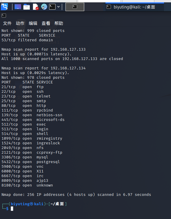 扫描端口开放情况。并附截图,说明其中四个端口(知名端口)提供的服务,查阅资料,简要说明该服务的功能。