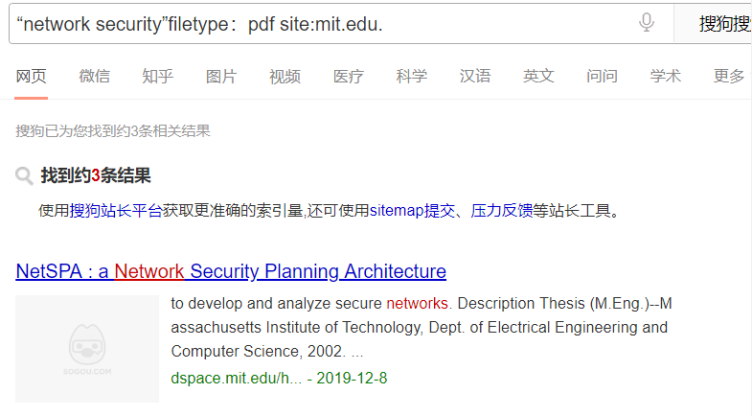 1、用搜索引擎Google或百度搜索麻省理工学院网站中文件文包含“network security”的pdf文档,截图搜索得到的页面