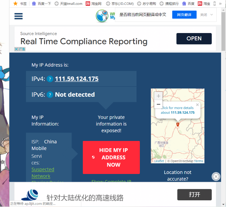 4.2访问https://whatismyipaddress.com得到MyIP信息,利用ipconfig(Windows)或ifconfig(Linux)查看本机IP地址,两者值相同吗?如果不相同的话,说明原因。