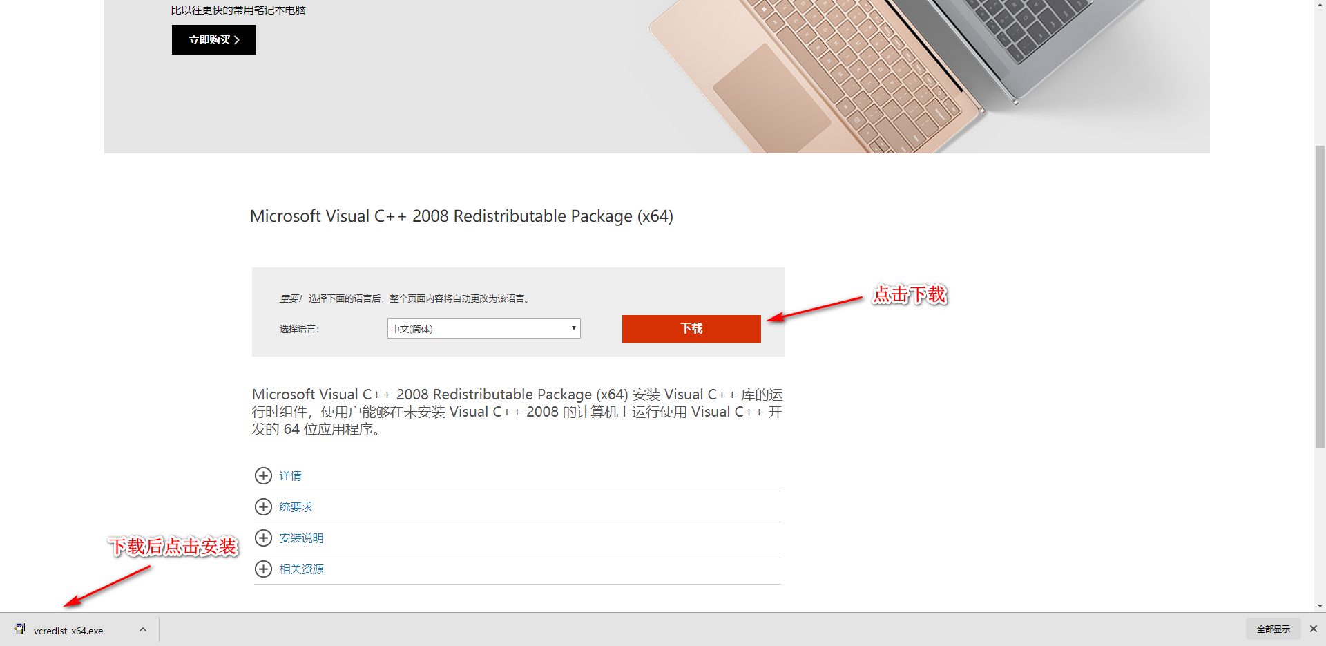 下载一个Microsoft Visual C++ 2008 Redistributable Package (x64)文件:下载链接;