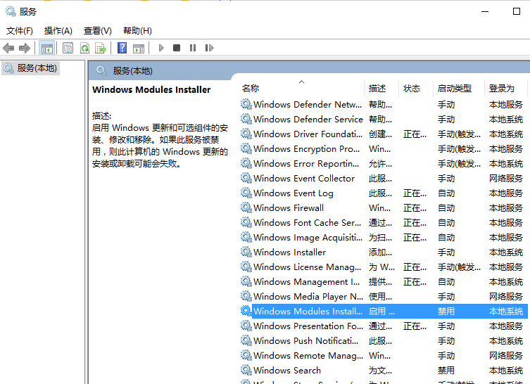 我们在服务(本地)窗口找到:Windows Modules Installer服务,查看是否被禁用;