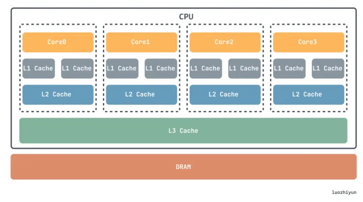 目前 SRAM 主要集成在 CPU 里面,每个 CPU 核心都有一块属于自己的 L1 高速缓存,通常分成指令缓存和数据缓存,分开存放 CPU 使用的指令和数据。L2 的 Cache 同样是每个 CPU 核心都有的,不过它往往不在 CPU 核心的内部。所以,L2 cache 的访问速度会比 L1 稍微慢一些。而 L3 cache ,则通常是多个 CPU 核心共用的。