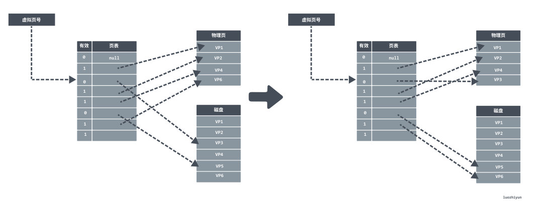 在下图中假设选择将存放在主存中的 VP6 进行替换,将 VP6 替换为 VP3。如果被替代的 VP6 已经被修改了,那么内核会将它复制回磁盘。