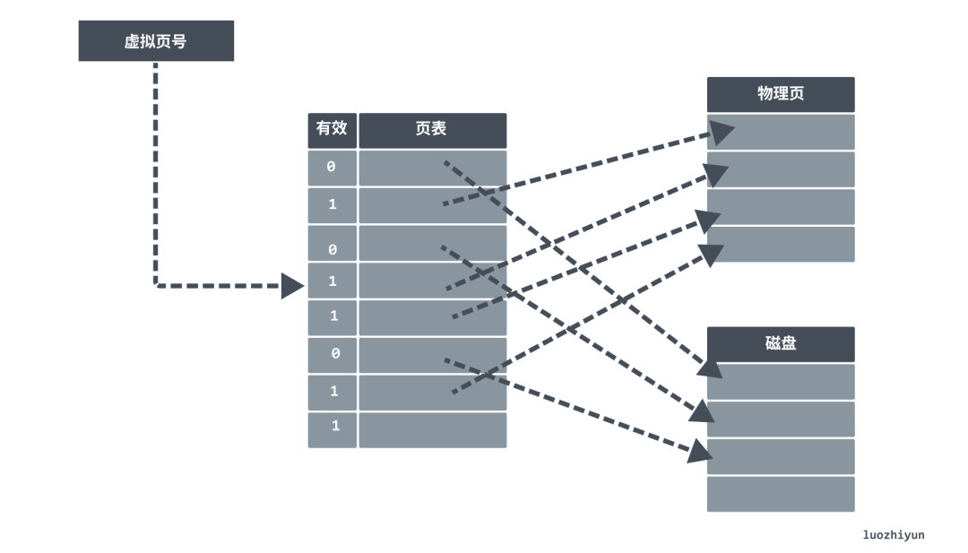 如果有效位关闭,那么该页就只存在磁盘上的某个指定的磁盘地址。缺页会触发缺页异常,然后在闪存或磁盘中找到该页,将其放入到主存 DRAM 中。