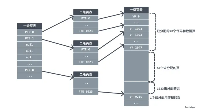 这种方法从两个方面减少了内存占用。第一,如果一级页表中的一个 PTE 是空的,那么相应的二级页表就根本不会存在。由于很多程序占用内存实际远小于页表所能表示的大小,所以可以节约很大空间的页表项资源;第二,只有一级页表才需要总是在主存中,二级页表会在需要的时候创建或销毁,只有最经常使用的二级页表才需要缓存在主存中,这就减少了主存的压力。