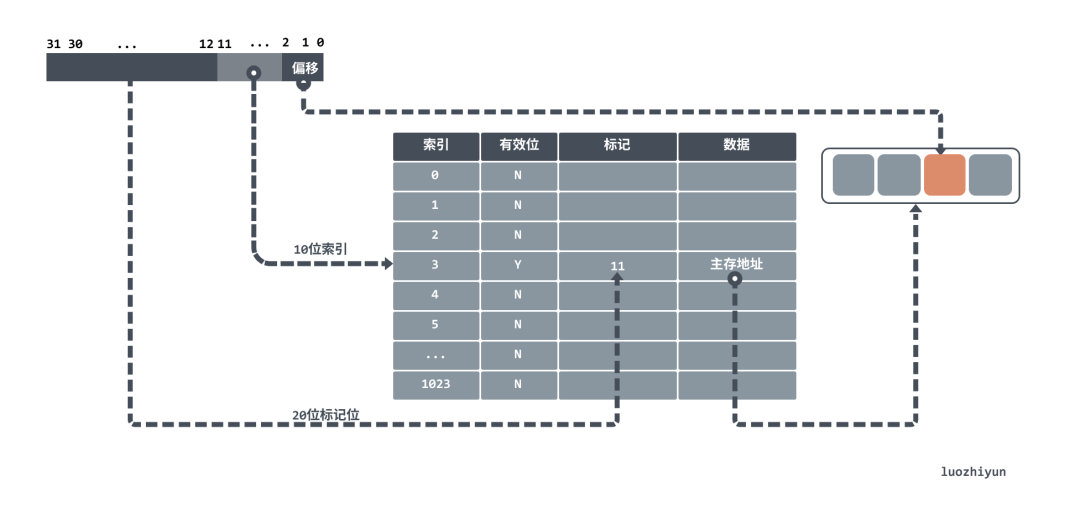 比如对于这个 cache 有 1024 个字,即 4KB。假设有一个 32 位的地址要去 cache 中查找数据,那么会取地址 10 位进行取模找到对应的 cache 行,然后取出 20 位与 cahce 标记位进行比较,如果相等,并且有效位开启,那么对应请求地址在 cache 中命中。否则,发生缺失。