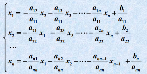 第 i 个 方 程 除 以 a i i ( i = 1 , 2 , … , n ) , 得 : 第i个方程除以a_{ii}(i =1,2,…,n),得: 第i个方程除以aii(i=1,2,…,n),得: