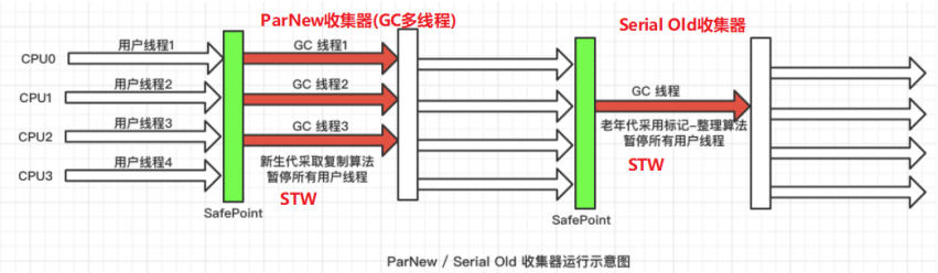 - 对于老年代,回收次数少,使用串行方式节省资源。(CPU并行需要切换线程,串行可以省去切换线程的资源)