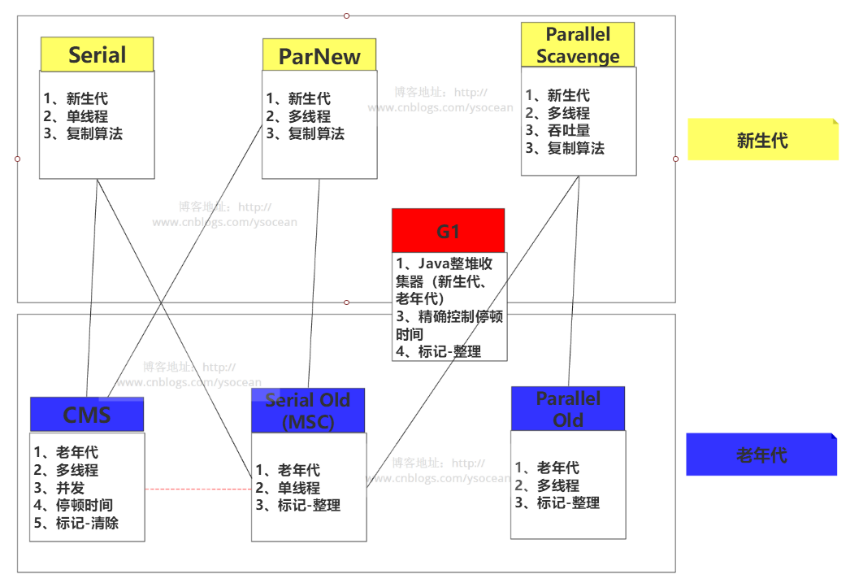 - 分代收集器:分代收集器顾名思义就是将Java堆中新生代和老年代使用不同的垃圾收集器来完成垃圾收集工作。
