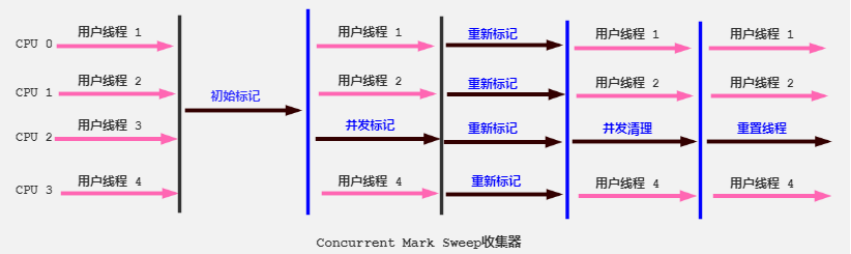 有了多线程Parallel,还是有STW,想注重用户线程的响应时间,不想让用户线程STW太多,所以就引入了CMS(Concurrent Mark Sweep),从名字看使用垃圾清除算法。
