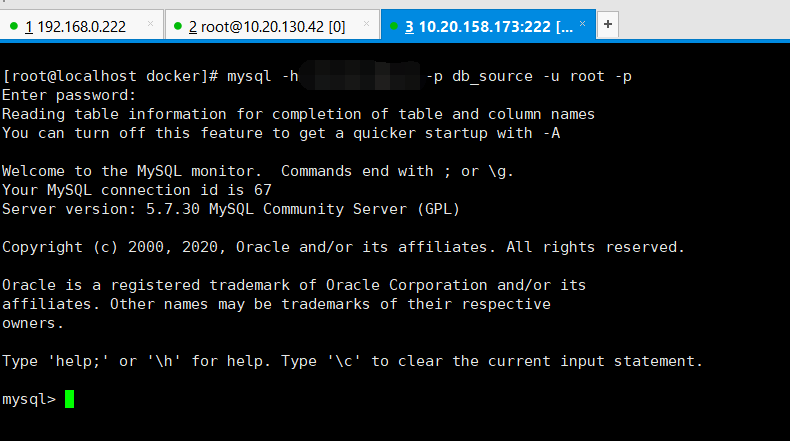 mysql -h IP地址 -p db_source -u root -pdb_source 要连接的数据库名称root 连接的用户名