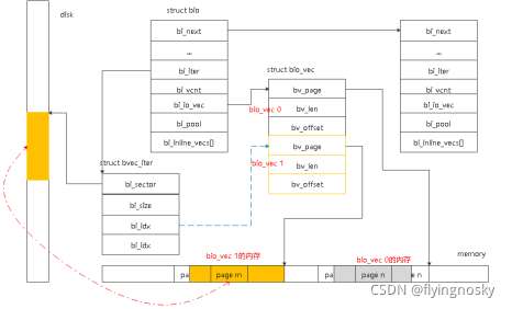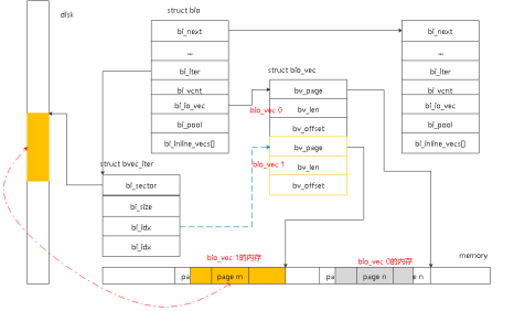 结构体bio_vec描述了IO数据在内存中的组织,通过此结构体可以找到数据在内存中的位置。每个bio可能包含多块连续的内存,每块连续的内存用结构体bio_vec表示,其中结构体bio_vec中bv_page指向本块连续内存的物理页的起始位置,bv_len指连续内存的长度,bv_offset表示连续物理内存的起始offset。