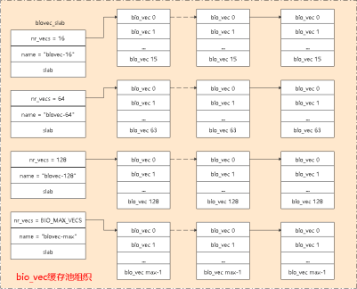 - biovec-max: biovec数目为BIO_MAX_VECS个,当数据的连续内存数目在129~BIO_MAX_VECS个时会从此缓冲池申请;