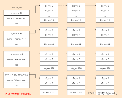 结构体biovec_slab为分配bio_vec的SLAB缓冲池。默认系统中定义了四种大小的SLAB缓冲池: