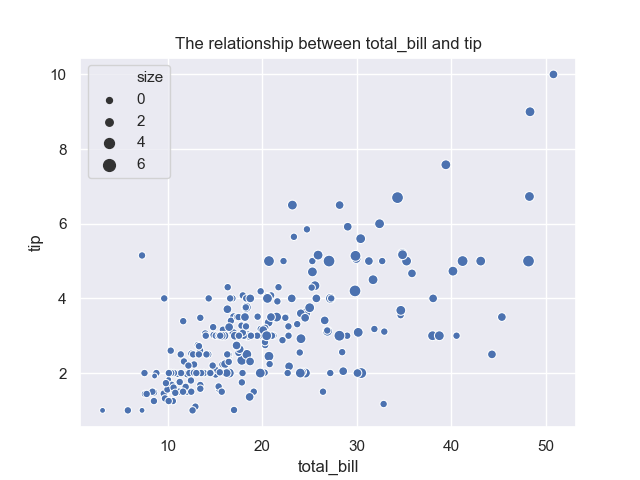 # size指定了散点图的大小表示的变量,其他参数与上例相同axes.set_title('The relationship between total_bill and tip')