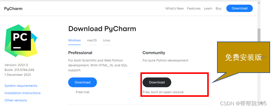 1.下载地址:Download PyCharm: Python IDE for Professional Developers by JetBrainsDownload the latest version of PyCharm for Windows, macOS or Linux.https://www.jetbrains.com/pycharm/download/#section=windows