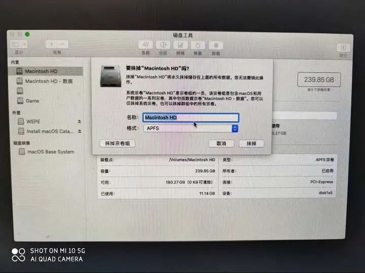 8. 选择要安装的盘,然后抹掉,格式为 APFS,名字不要有中文。