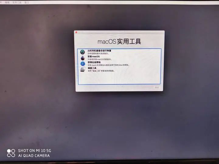 7. 如果不出意外,应该进入了 macOS 实用工具,选择磁盘工具,然后提前先准备一个 30 G以上的分区。