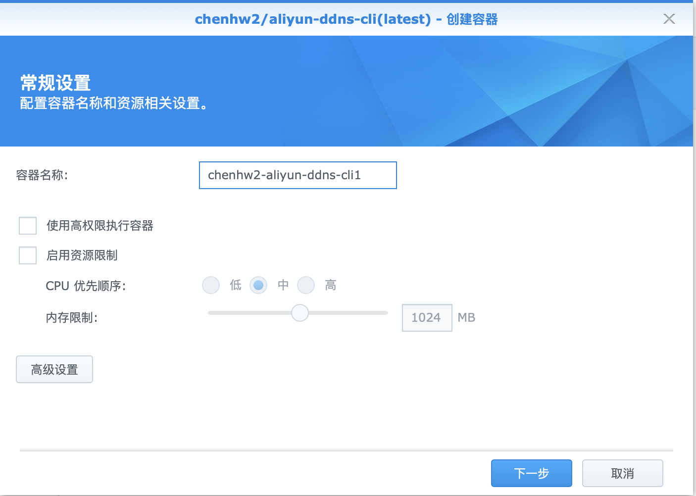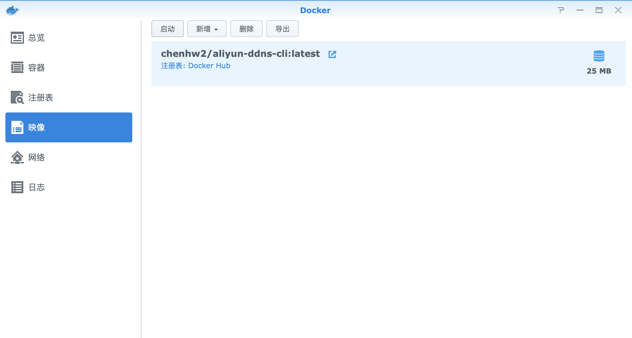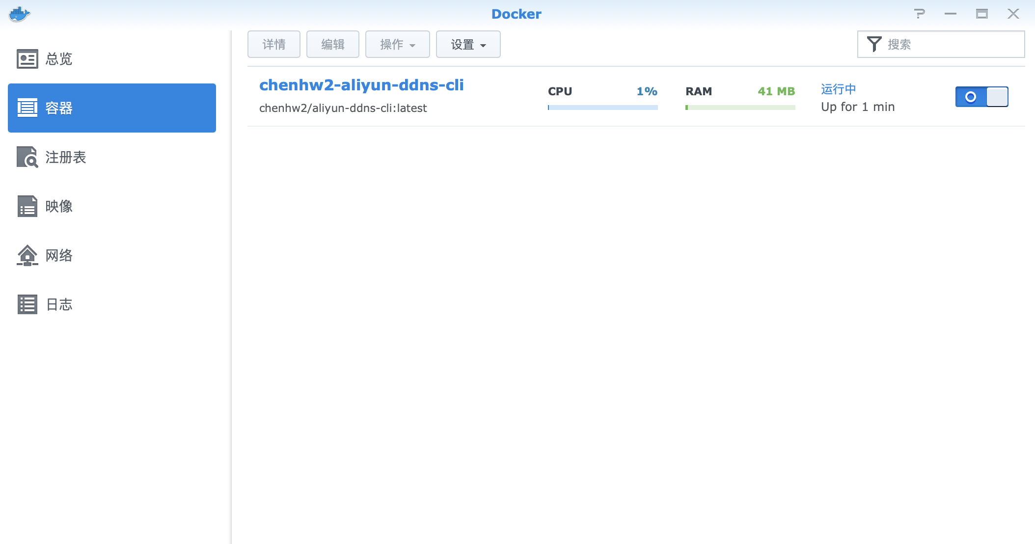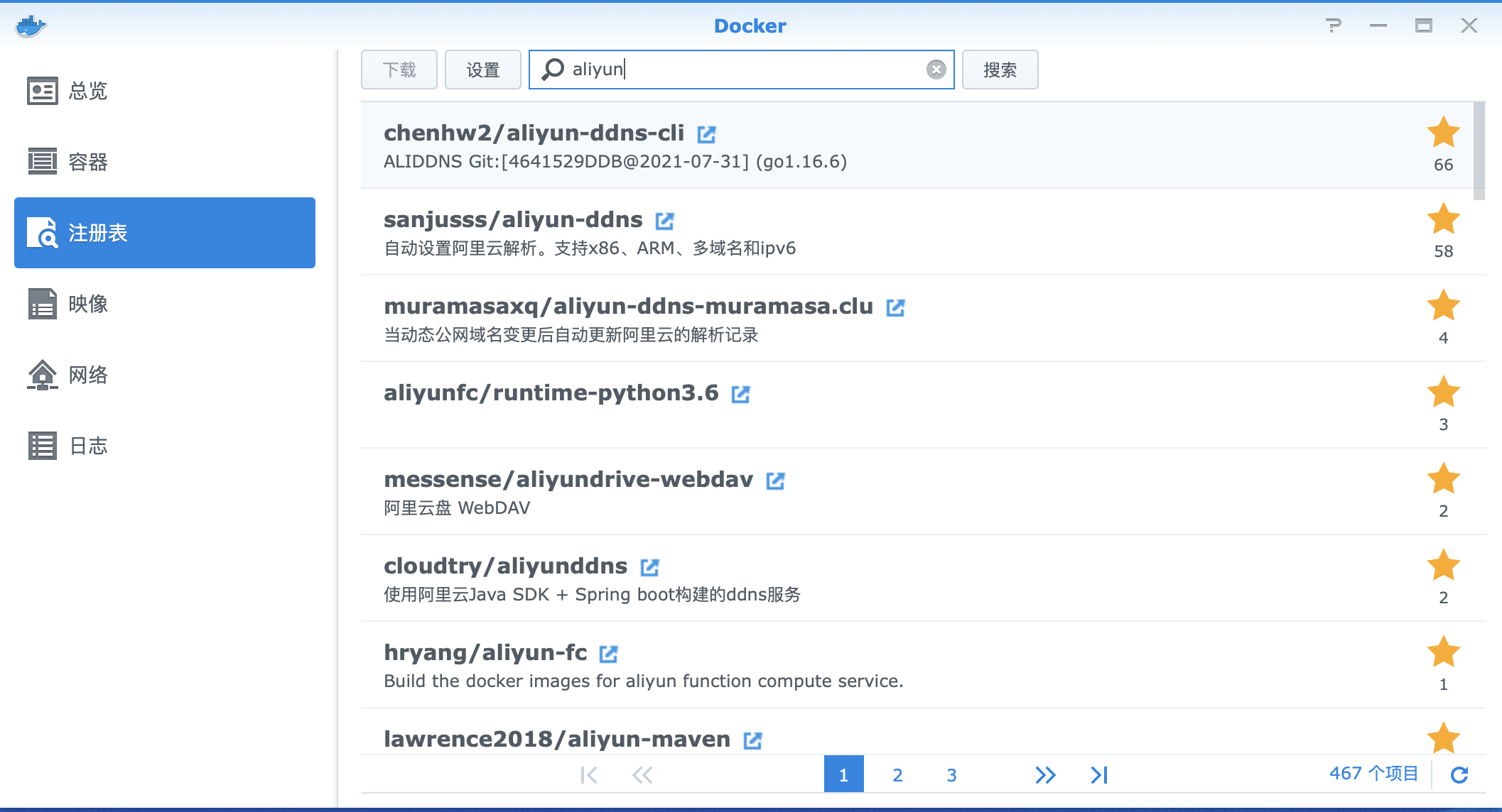 安装完毕后,打开docker,并单机注册表,然后搜索“aliyun",选择第一个搜索结果aliyun-ddns-cli并按第一行的下载,下载该映像