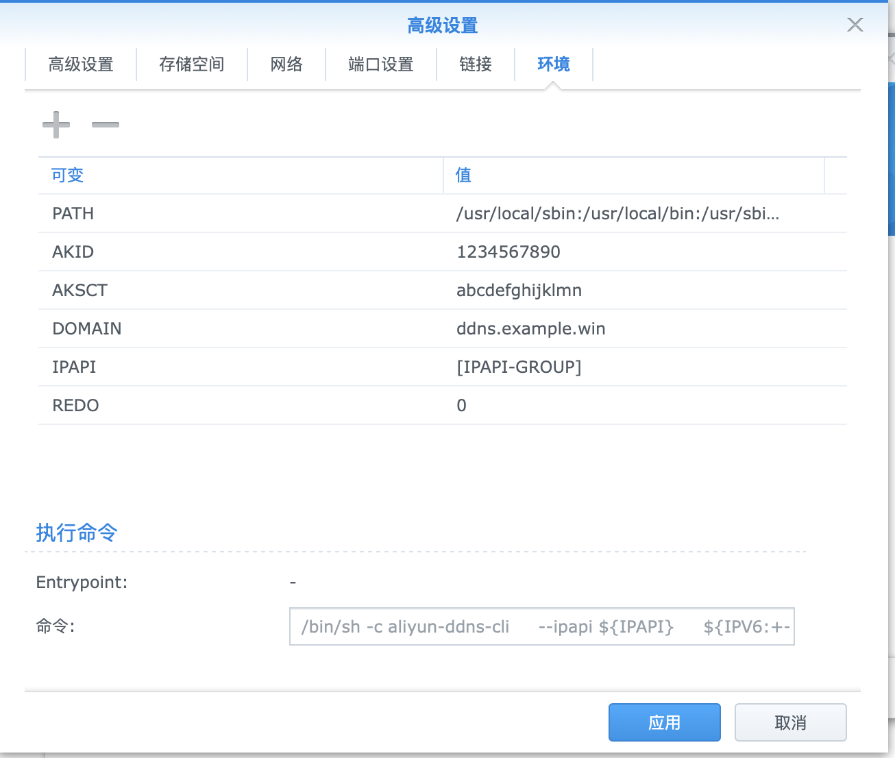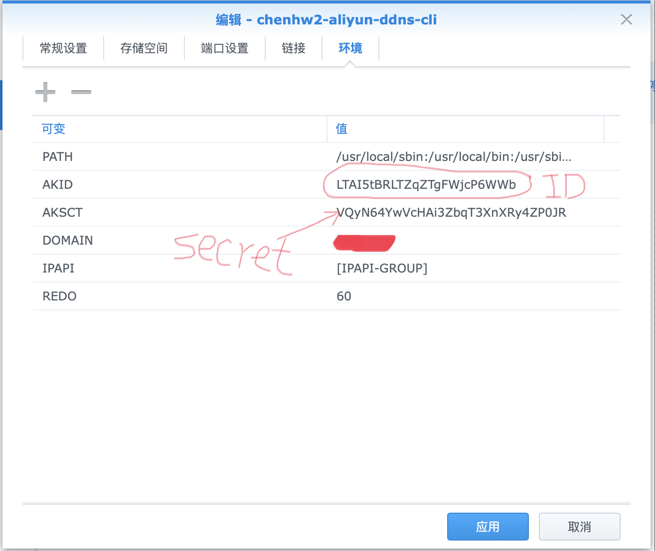回到群晖,在环境选项卡中输入我们得到的id和secret