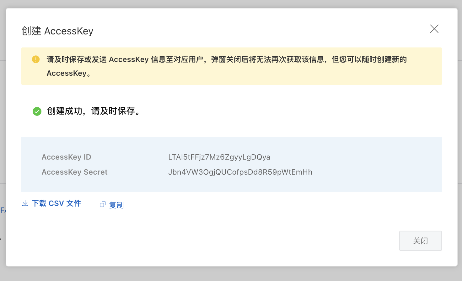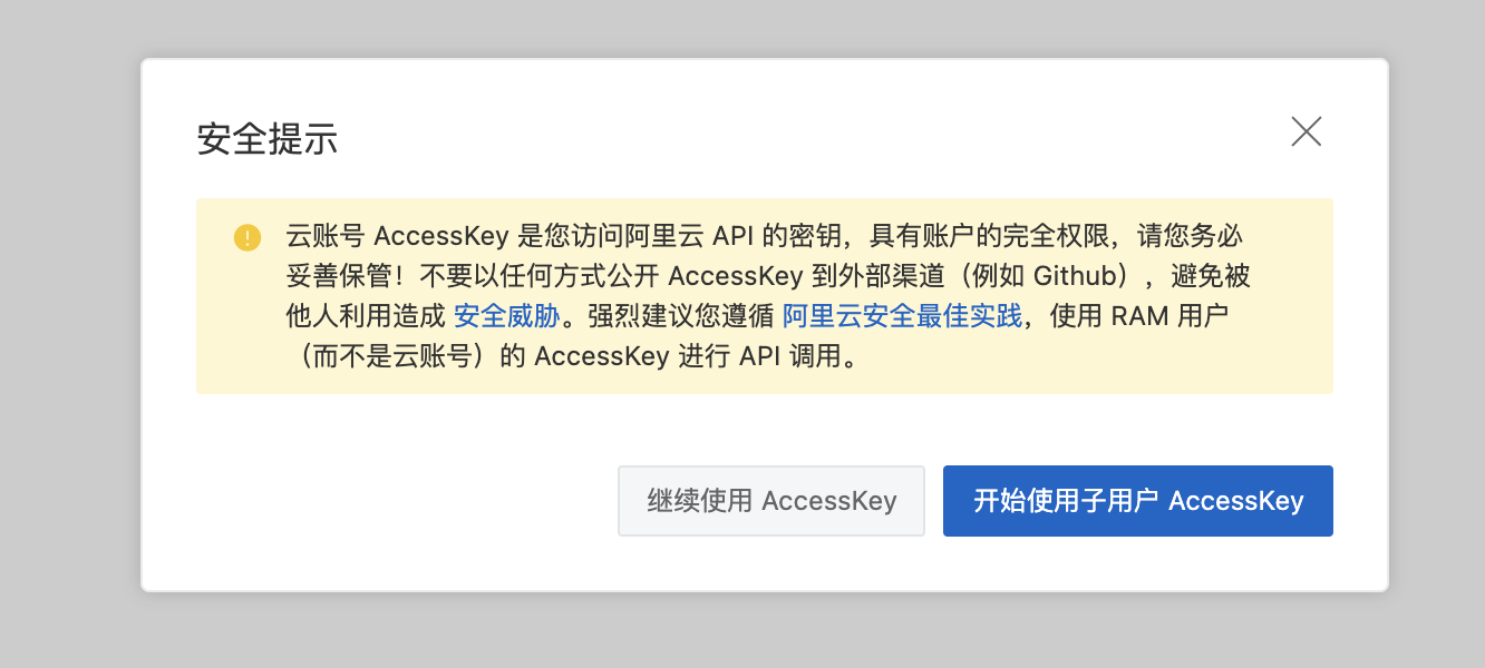此时会弹出提示窗口:云账号AccessKey是您访问阿里云API的密钥,具有该账户完全的权限,请务必妥善保管。请勿通过任何方式(如Github等)将AccessKey公开至外部渠道,以免被恶意利用而造成安全威胁。强烈建议您遵循阿里云安全最佳实践,使用RAM子用户AccessKey来进行API调用。