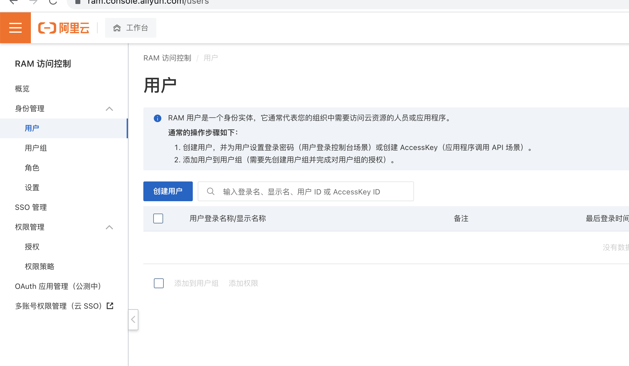 所以我们点击开始使用子用户,进入到RA访问控制后,单机蓝色的创建用户按钮: