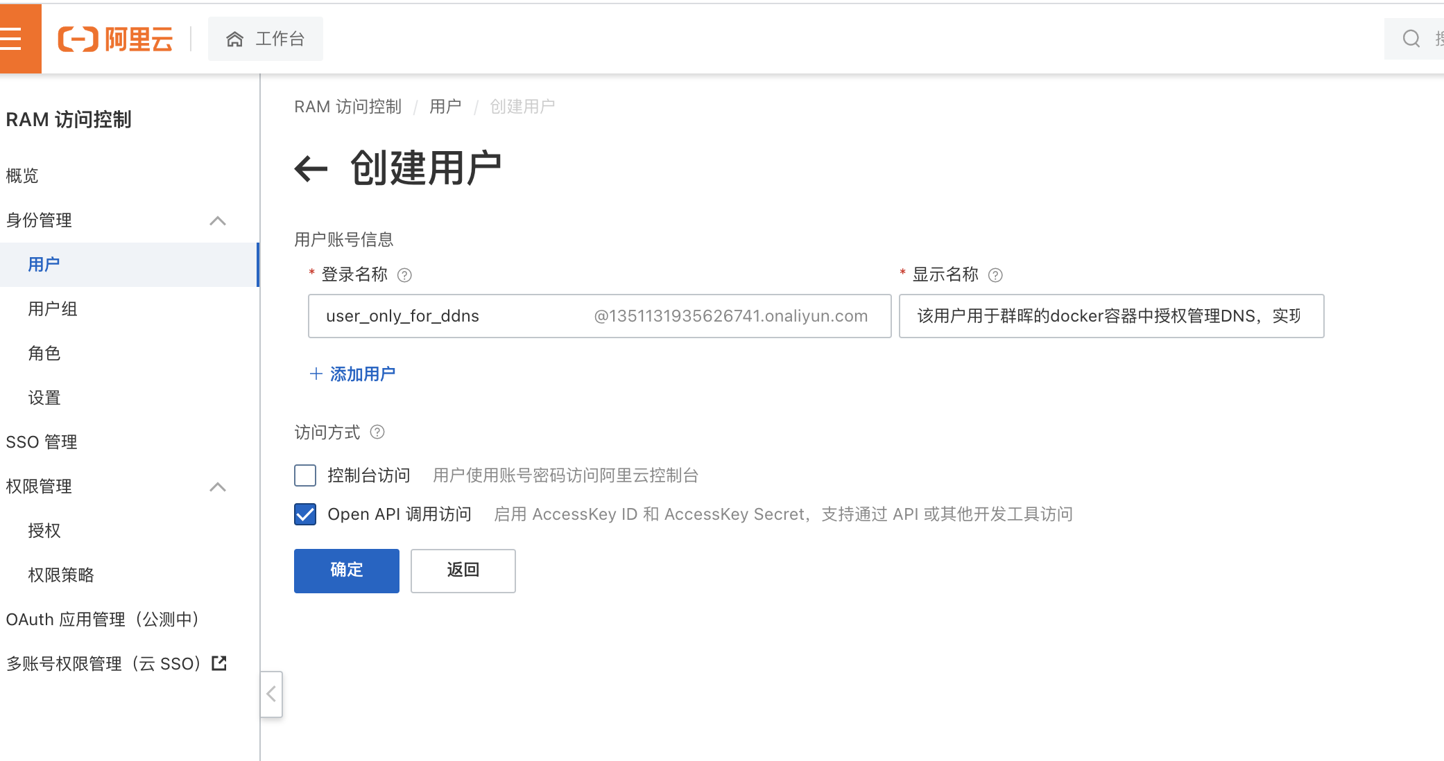 填写一个用户名和说信息,勾选open API选项就可以了,这个账户不需要控制台登录权限的。