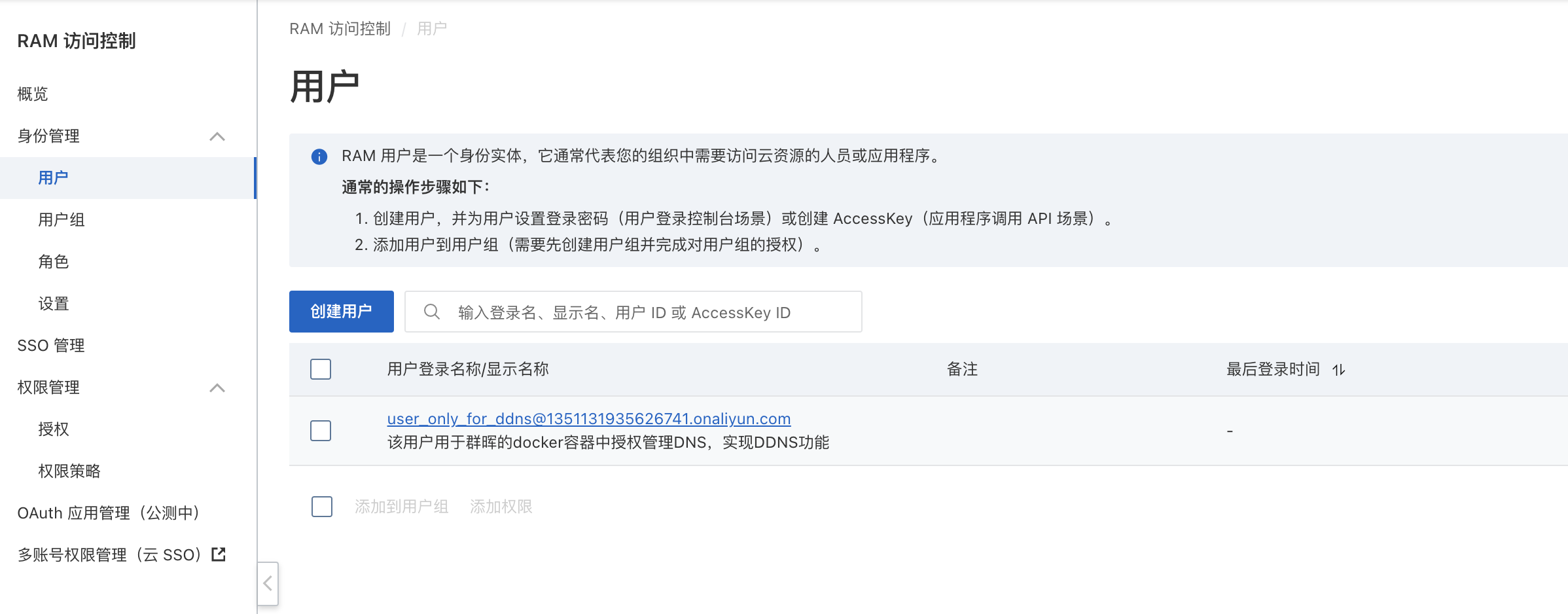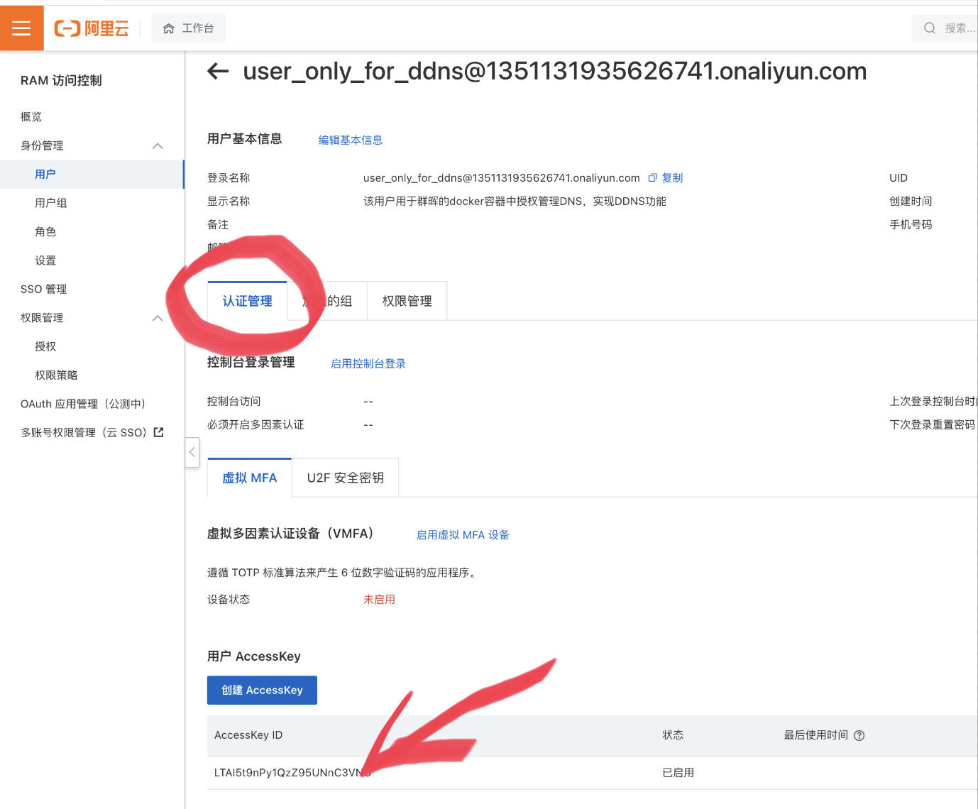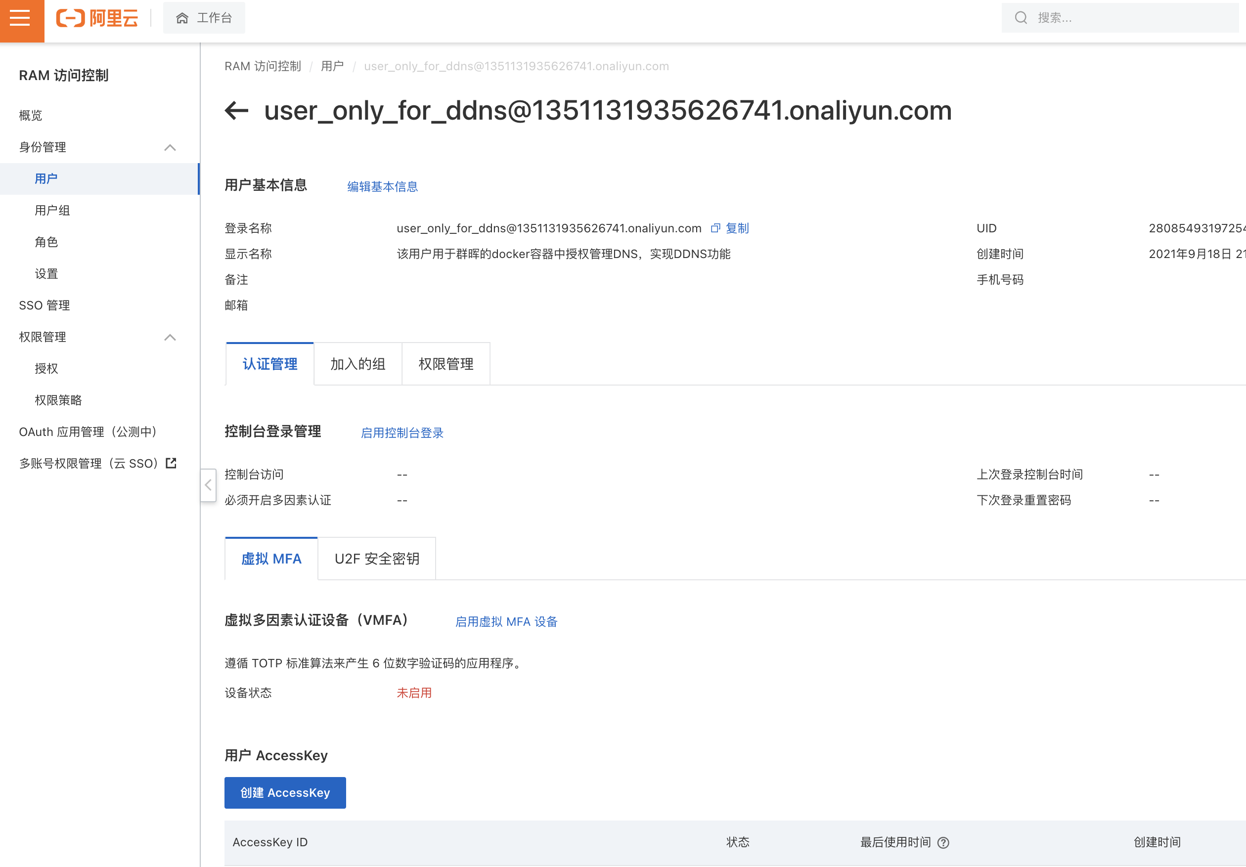 回到认证管理页,可以看到一开始已有一个accesskey id了,但是看不到密码,而且这个密码也无法再重新查看了,只能后面新建一个Accesskey id