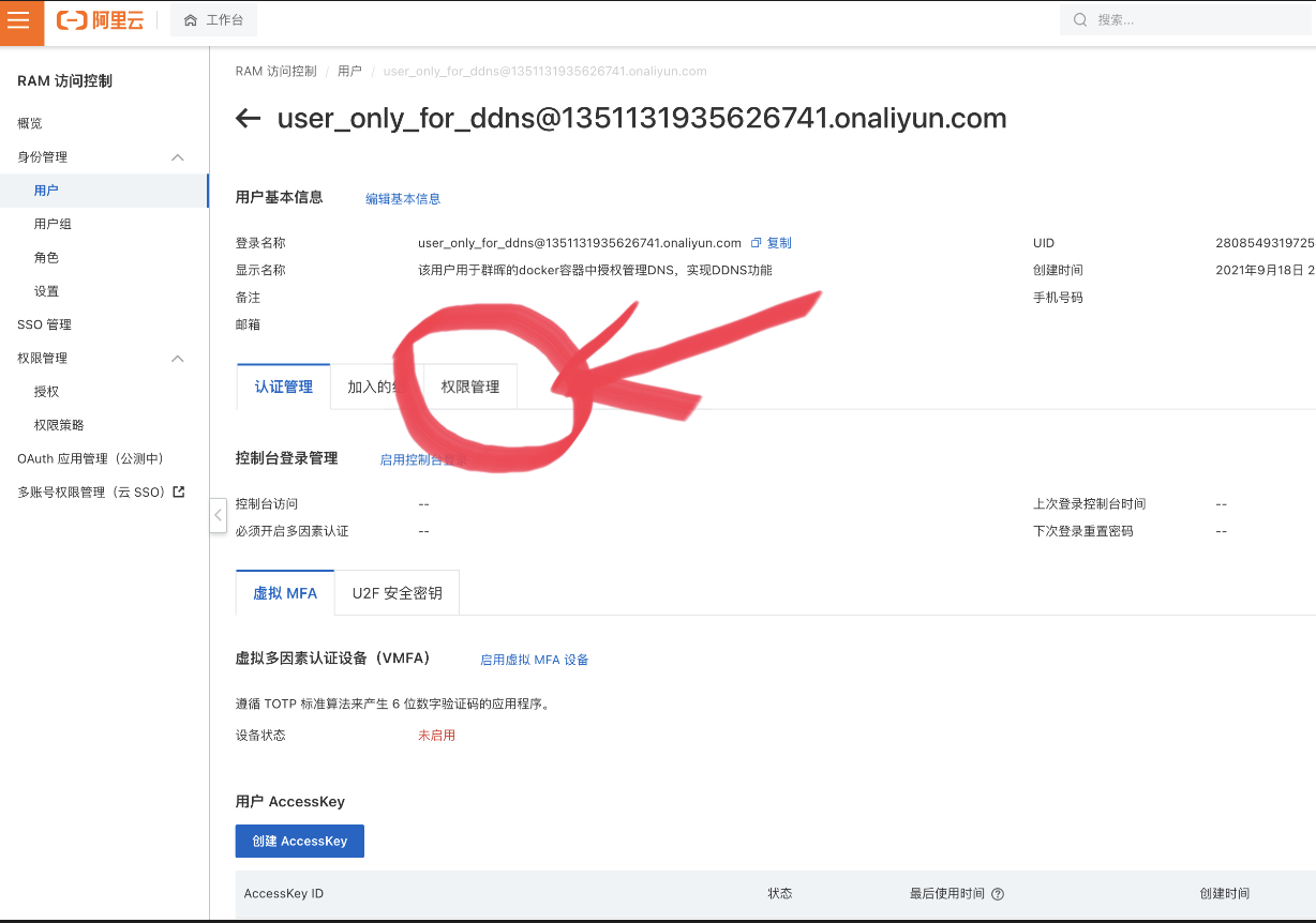 现在我们需要从阿里云中获取AKID、AKSCT两项内容,他们是登录阿里进行ddns设置的用户权限,这个需要从阿里云的accesskey获取。