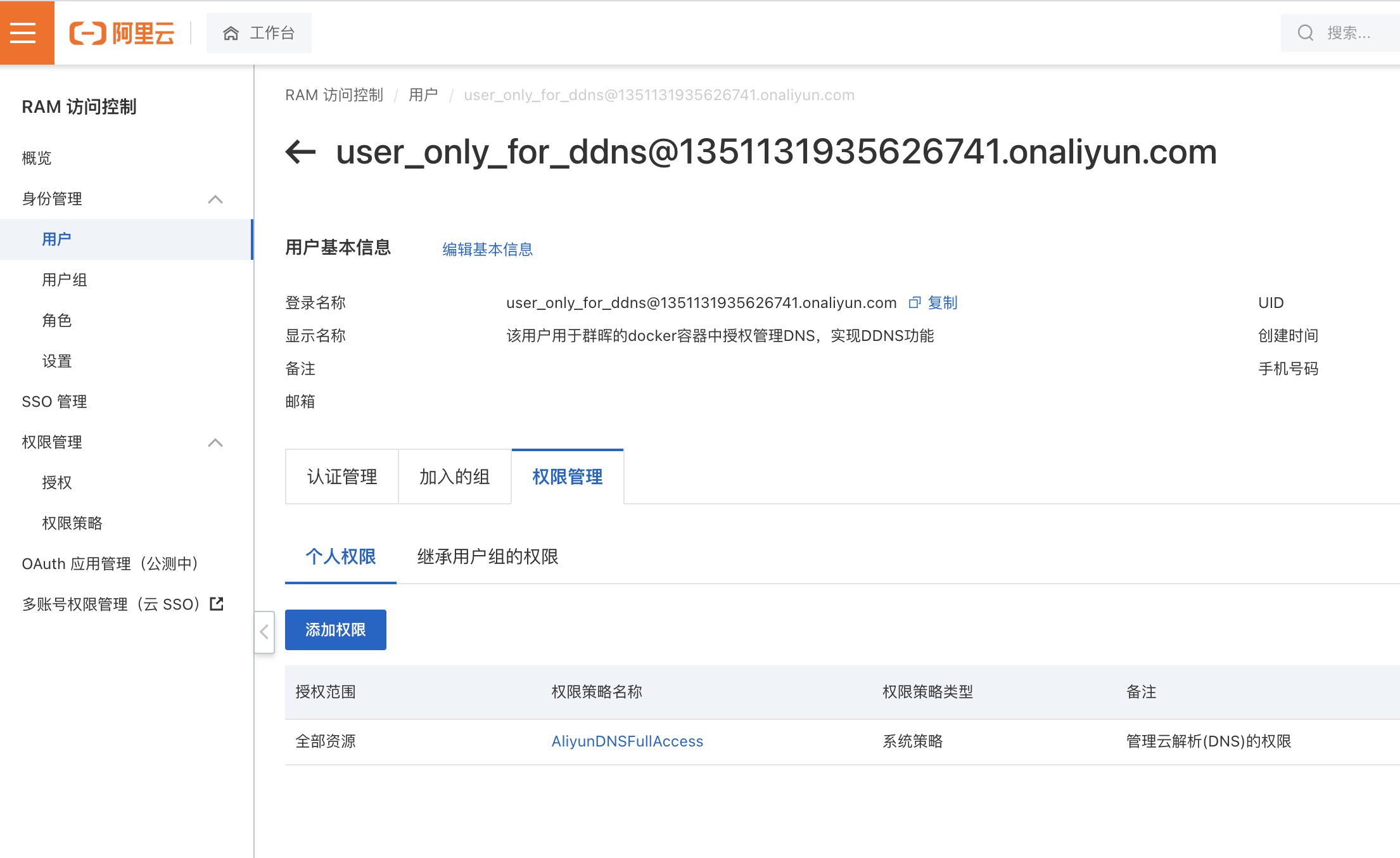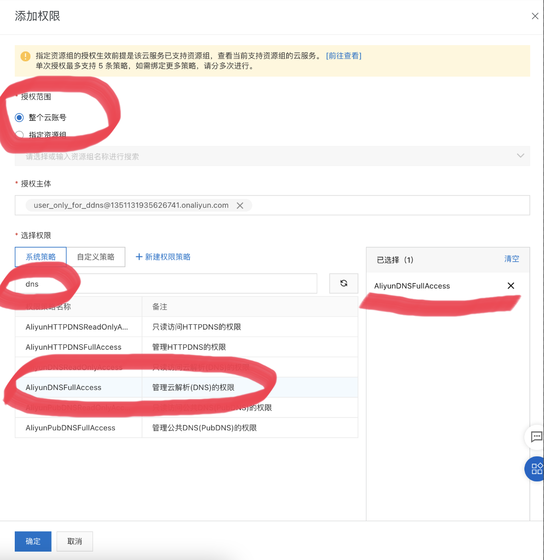 在随后,选择授权范围为整个云账号、授权主体保持默认的刚刚创建的这个子账户名、在选择权限中输入dns搜索并选择AliyunDNSFullAccess,最后单机左下角的确定按键。