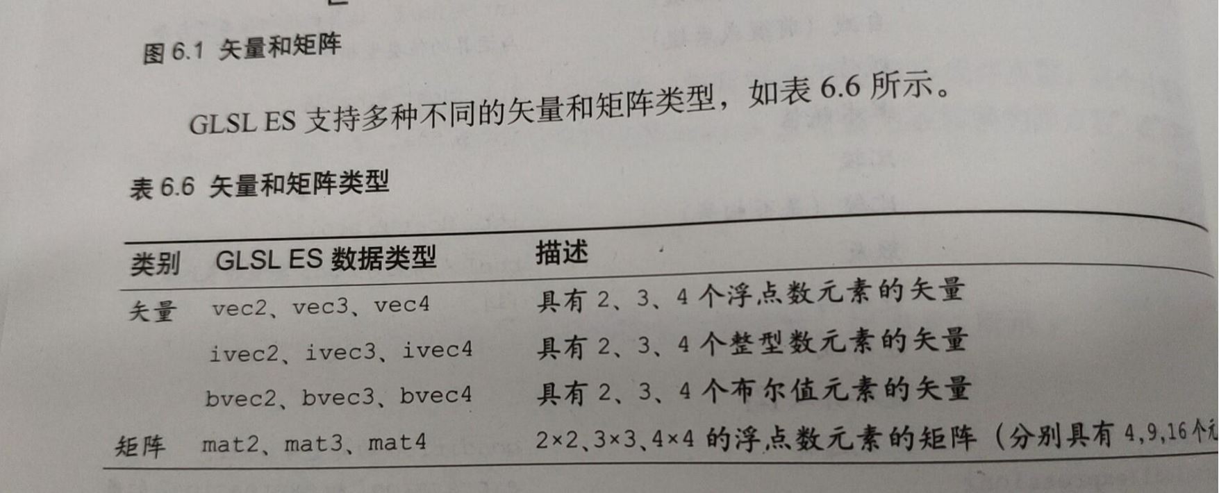 1.数据类型:GLSL ES支持两种数据值类型:数值类型(整型、浮点型)和布尔值类型。GLSL ES不支持字符串类型
