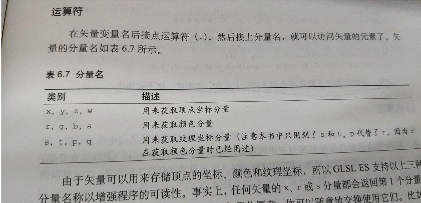 上述三个集合中,x, r, s代表的都是矢量的第一个分量,可以使用任意一个集合来访问,设置三种集合是为了增强程序可读性。可以将多个变量名共同置于点运算符之后,代表同时访问多个变量