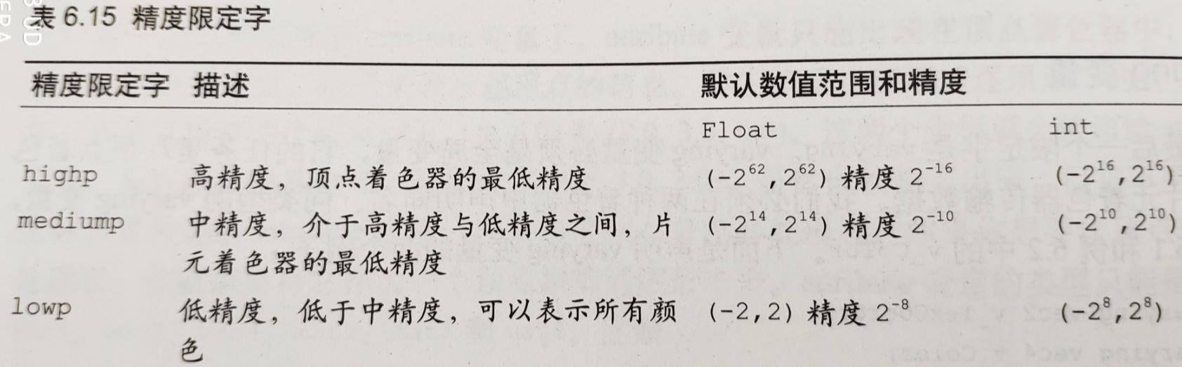 注意:(1)在某些WebGL环境中,片元着色器可能不支持highp精度;(2)数值范围和精度与系统环境有关