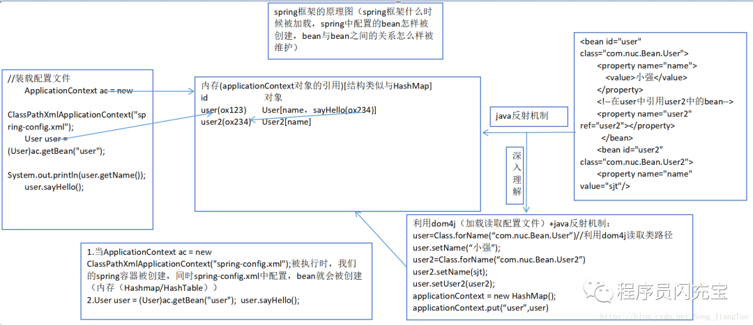那么bean中的东西到底是怎么注入进去的?**简单来讲,就是在实例化一个bean时,实际上就实例化了类,它通过**反射调用类中set方法将事先保存在HashMap中的类属性注入到类中。这样就回到了我们Java最原始的地方,对象.方法,对象.属性