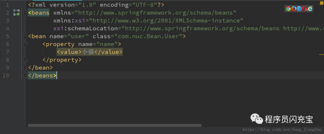 <bean></bean>这对标签元素的作用:当我们加载spring框架时,spring就会自动创建一个bean对象,并放入内存相当于我们常规的new一个对象,而<property></property>中的value则是实现了“对象.set方法”,这里也体现了注入了概念