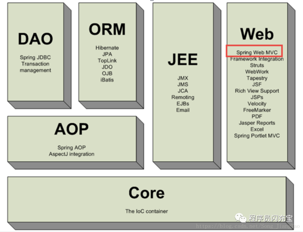 Date Access/Integration层包含JDBC,ORM,OXM,JMS和Transaction模块