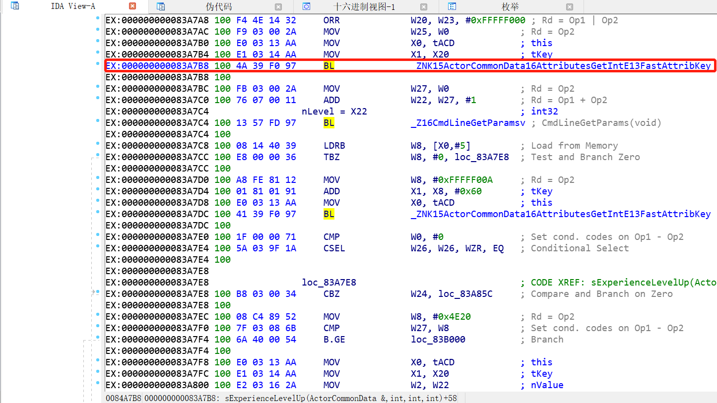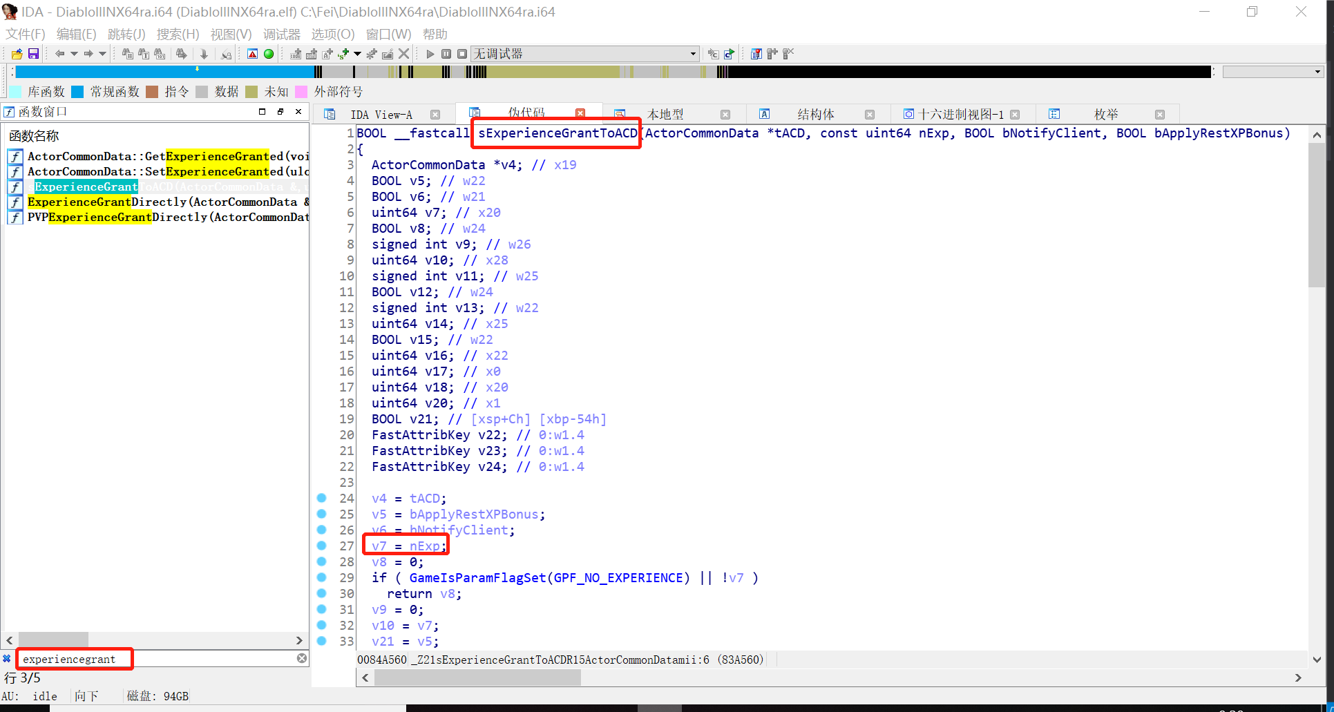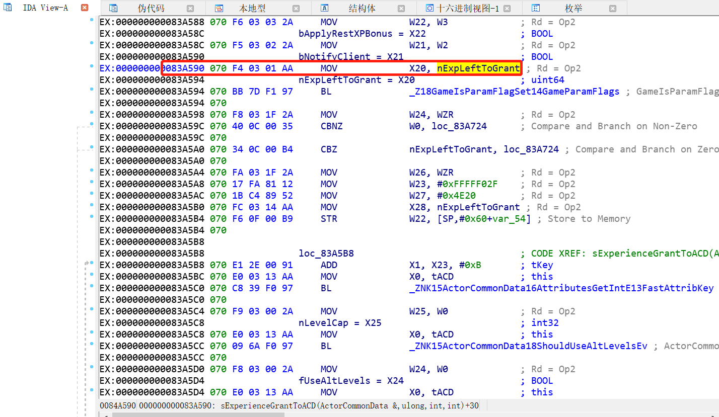 1. 在游戏中特别是在游戏后期,我们会发现人物随着等级的提高,升级所需的经验值也越来越高,呈现指数级增长,每升一级越来越困难,再加上练小号升级到70的漫长过程也是令人烦恼的,为了能够快速升级,我们考虑去修改经验值的获取量,首先,在原始版本中搜索经验获取英文experiencegrant,找到了sExperienceGrantToACD函数,继而找到了要hack的地方,转到汇编代码,再找到2.6.6的地址,hack掉这条指令,做成金手指代码即可
