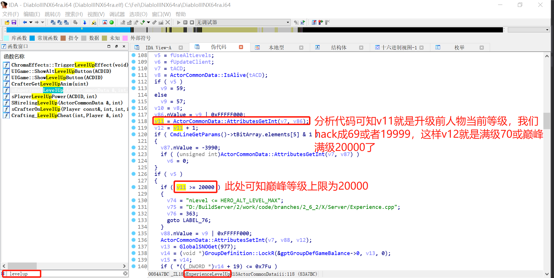 2. 进游戏测试一下经验值金手指,果然人物升级变快了,基本上杀几个怪升一级,不过,我们还是觉得有些慢,有没有一种方法可以直接升到满级呢?答案是肯定的,我们开始寻找这种办法,搜索levelup,发现函数sExperienceLevelUp,点进去找到了要hack的地方,然后找到2.6.6对应的地址进行hack,写成金手指代码即可