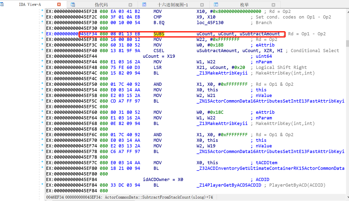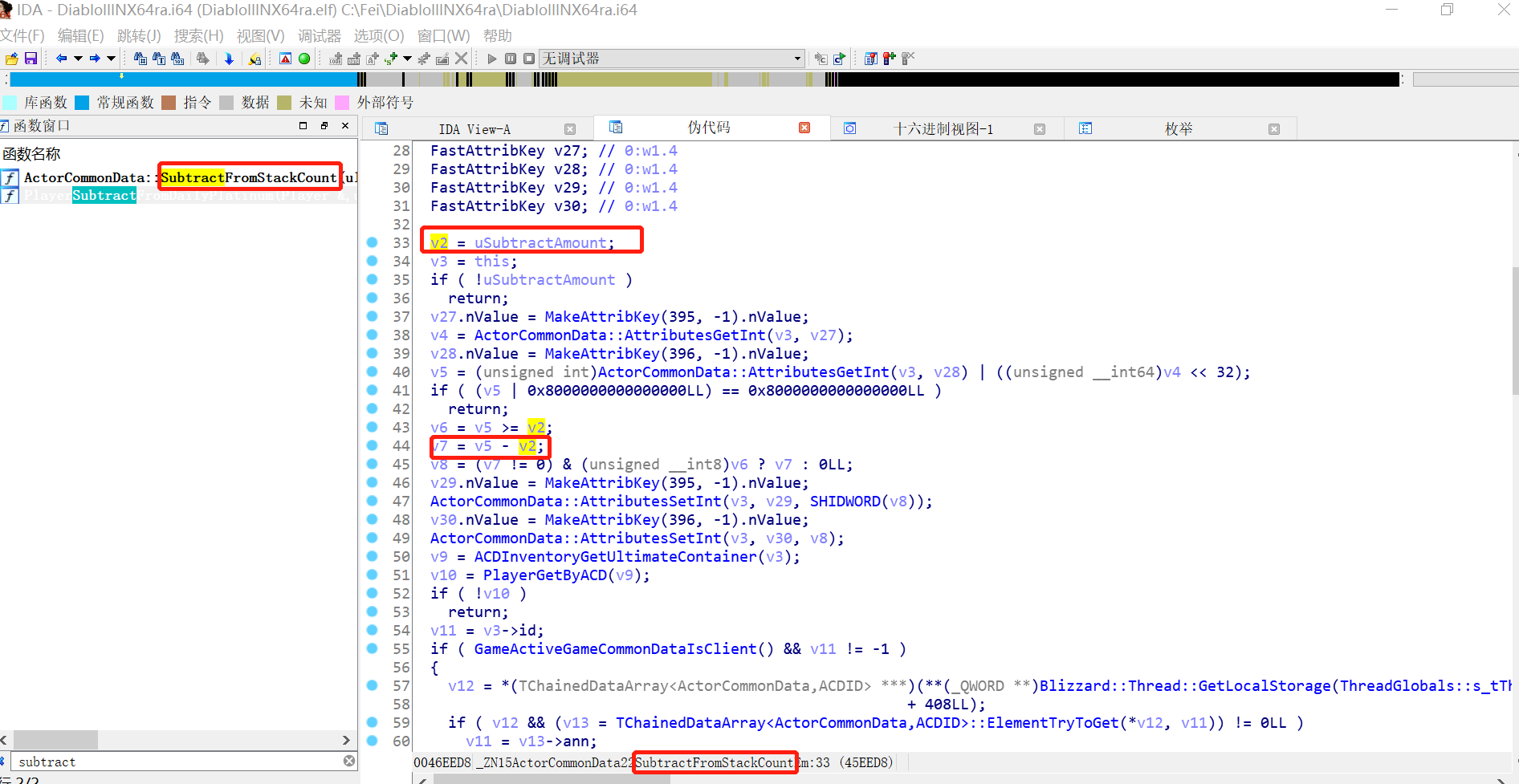 3. 进游戏测试一下,升一级直接70级,再升级直接20000级,完成。接下来我们要做的另一个功能就是宝石等材料的数量修改,我们在原始版本里搜减的英文subtract,发现了函数SubtractFromStackCount,字面意思是从堆中减去,可以理解为玩家消耗或者丢弃背包和仓库的堆类物品时会调用此函数,那么继续往下看,就找到了我们要hack的地方,也就是减少的指令,找到2.6.6对应的地址,hack掉即可,改为mov X19, 9999,那么扔掉一部分数量的材料,剩余的就会变成9999啦