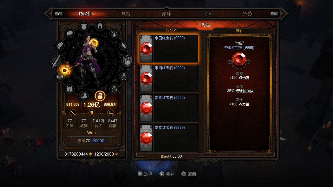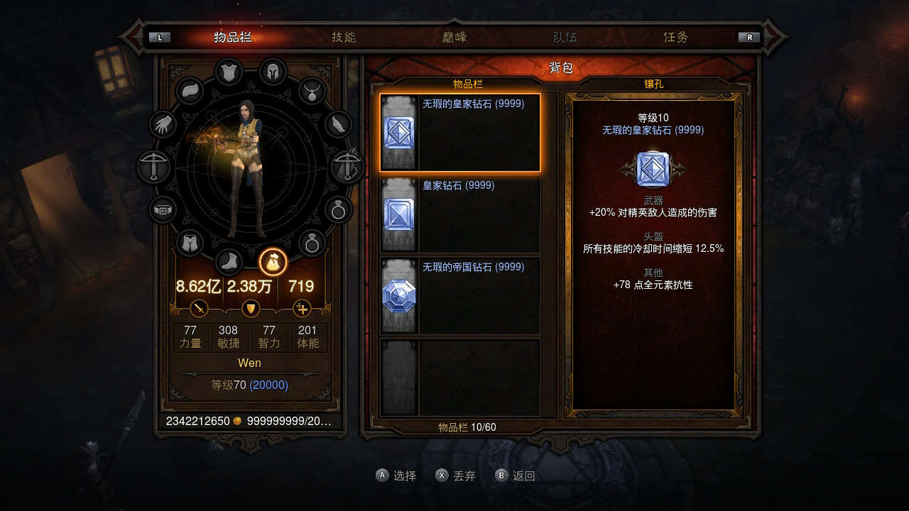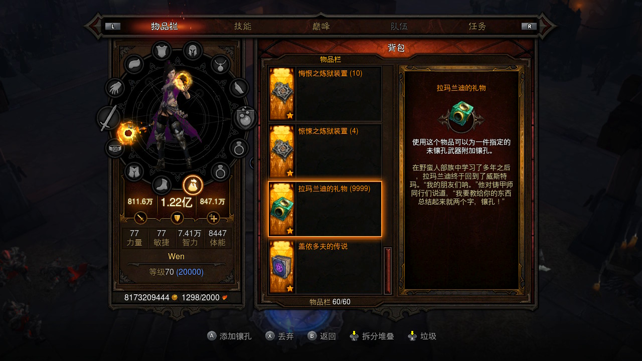 4. 我们进游戏测试,从背包里扔掉1颗宝石,或者从仓库里物品堆中取出一部分,比如萨玛兰迪的礼物(打孔器),剩余的数量果然变成了9999,开心吧