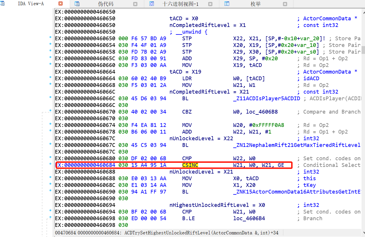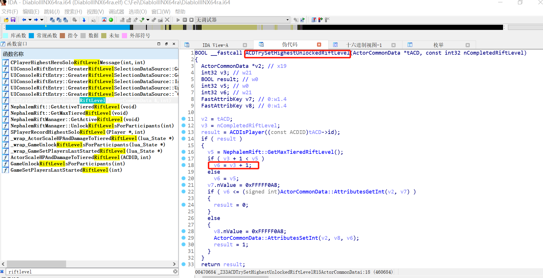 5. 接下来,我们讲解如何在通过一次大秘境后直接解锁最高层150层,大秘境又称奈非天裂隙,因此搜索riftlevel,发现函数ACDTrySetHighestUnlockedRiftLevel,点进去,找到要hack的地方,转到汇编,然后找到2.6.6的地址,做hack即可,我们把原指令改为mov w21,w0,就把最大层数(150)赋值给了w21,这样当我们通过任意一层大秘境时,最大层也被设置为了上限150