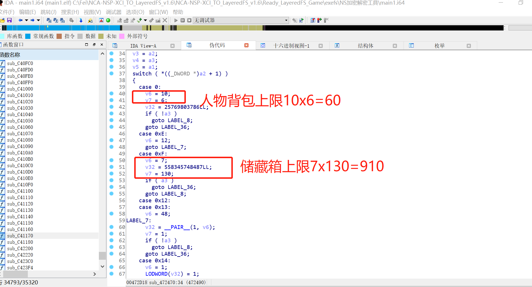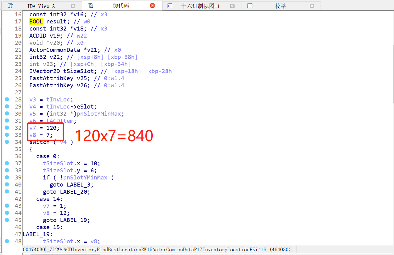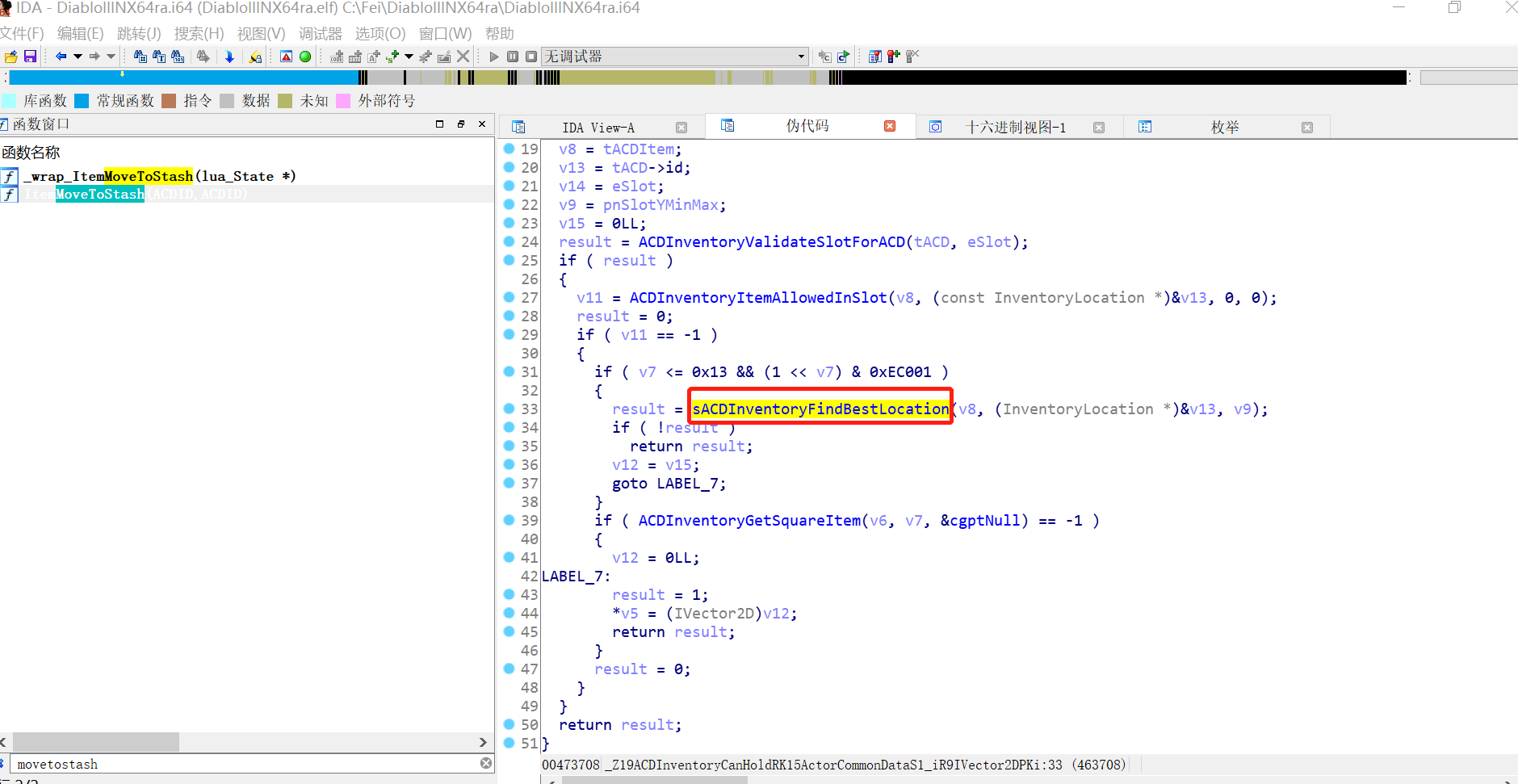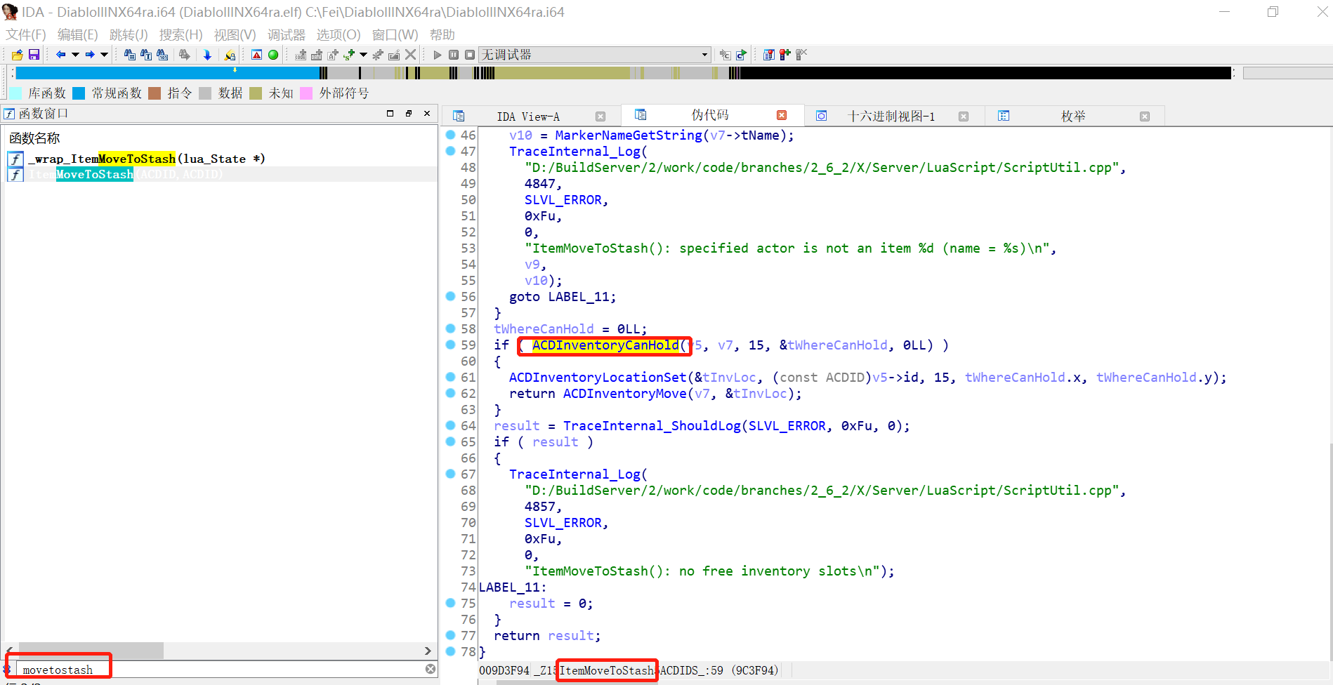 6. 当我们在游戏里获取的装备和物品过多时,仓库数量上限350明显不够用,于是我们有了修改仓库上限的想法,想要修改上限,首先要找出上限值,因为在物品移动到仓库时会判断是否达到上限,因此我们搜索movetostash,发现了ItemMoveToStash,然后打开伪代码,往下又发现了ACDInventoryCanHold,双击打开,又发现了sACDInventoryFindBestLocation,继续打开,往下看,分析代码找到了上限840,然后根据附近代码相似找到2.6.6版本的上限,发现2.6.6版本的上限是910,因此仓库上限就是910