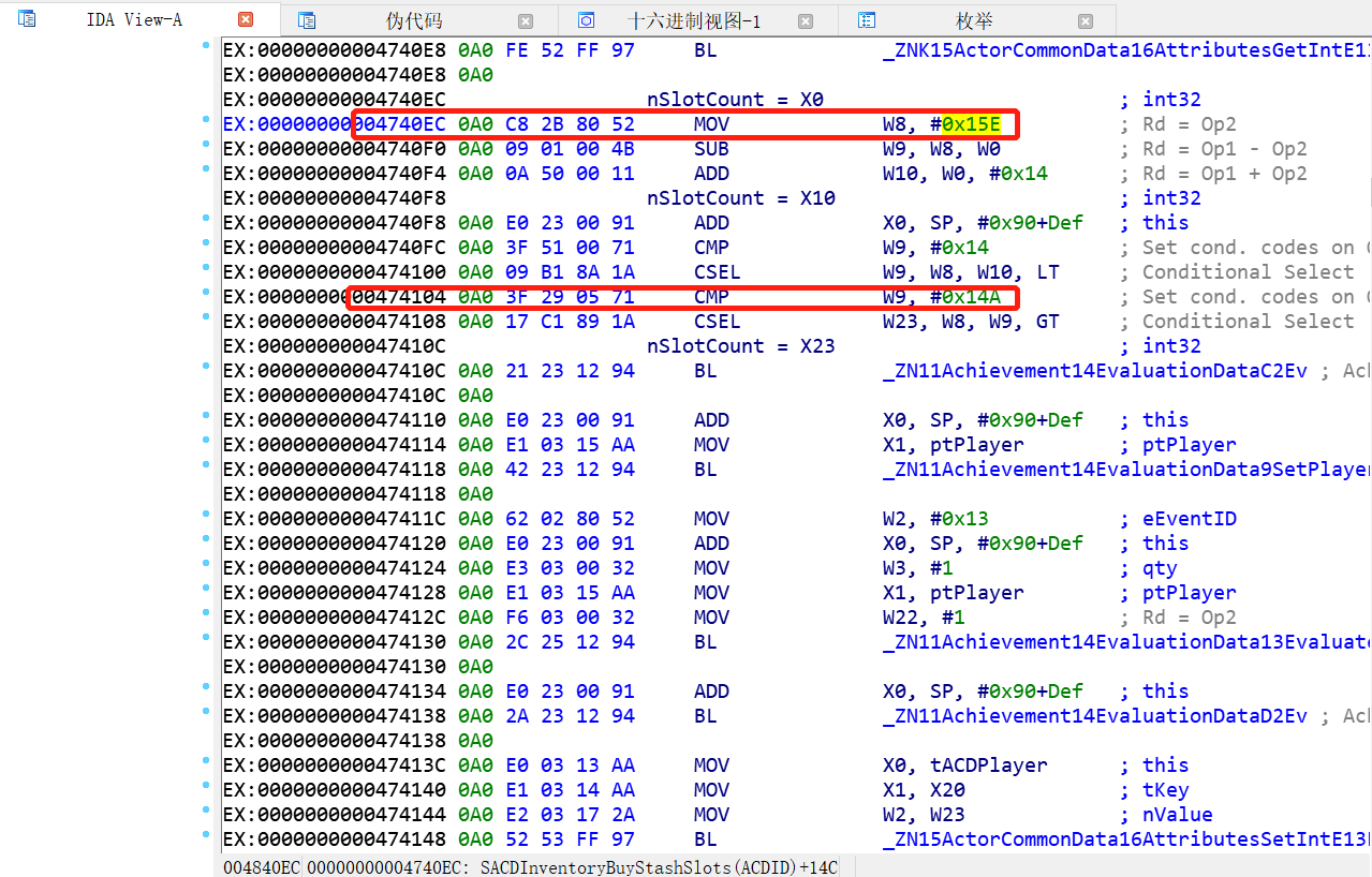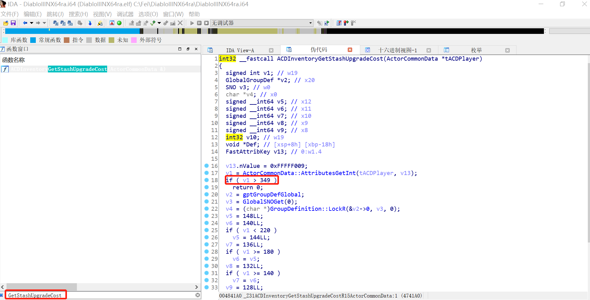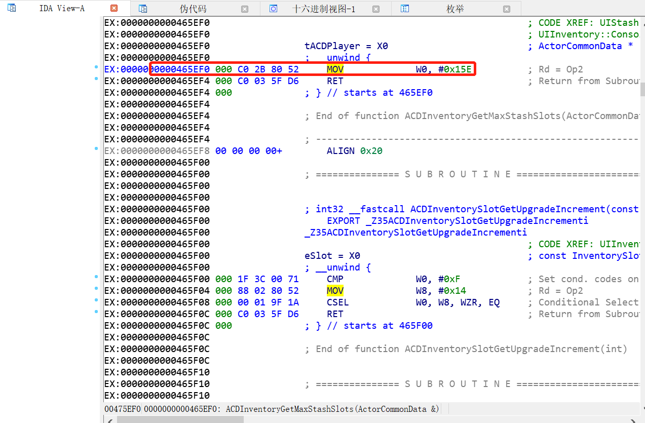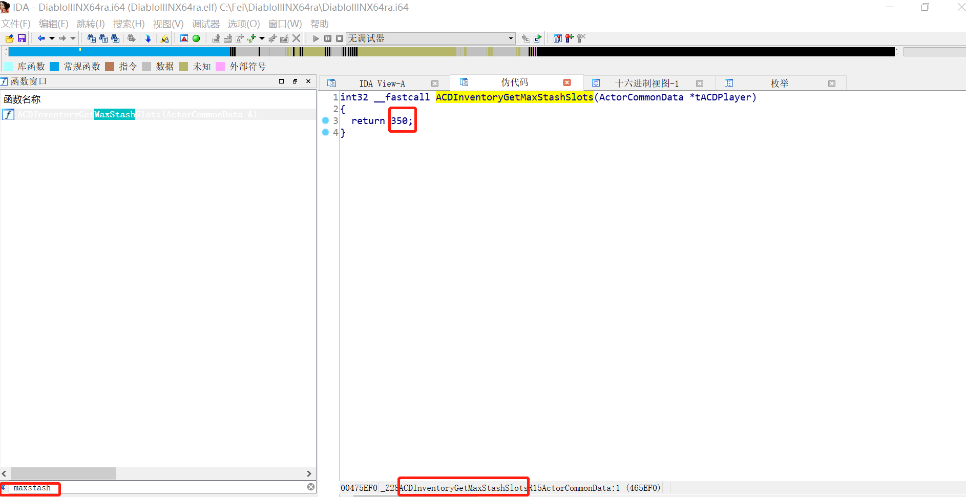 7. 知道了储藏箱上限,接下来就简单了,我们搜索maxstash,发现函数ACDInventoryGetMaxStashSlots,双击打开,发现默认上限是350,找到2.6.6的地方,Hack掉